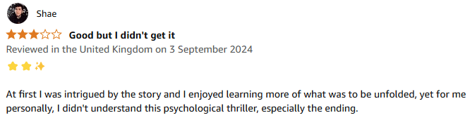 - I think some people might be expecting it to remain within the mainstream psychological thriller genre – and when the twist pushes it into a subcategory of that genre they’re not always happy (and no, it’s not mucking around with time slip / time travel – I don’t like those much either!)
